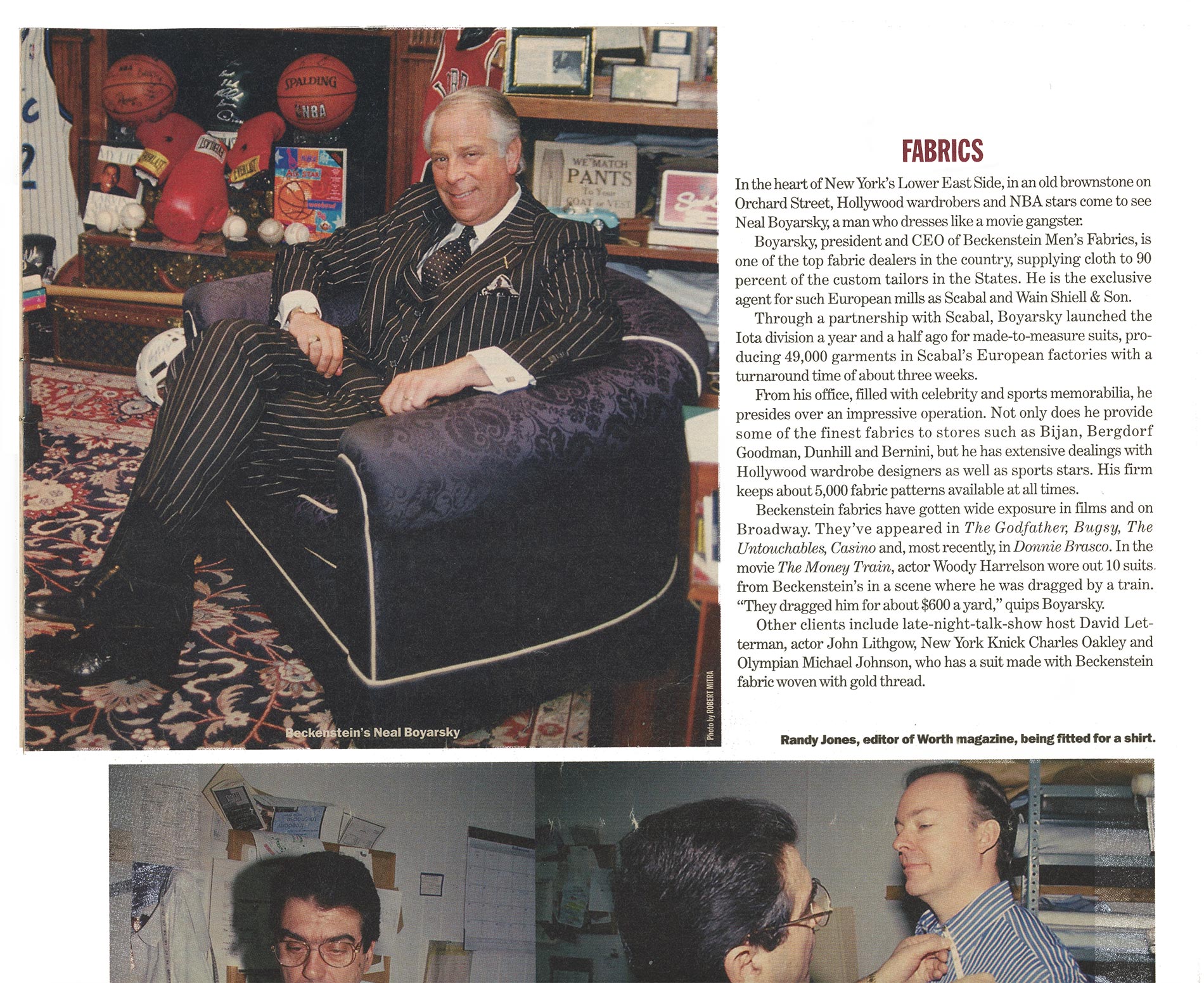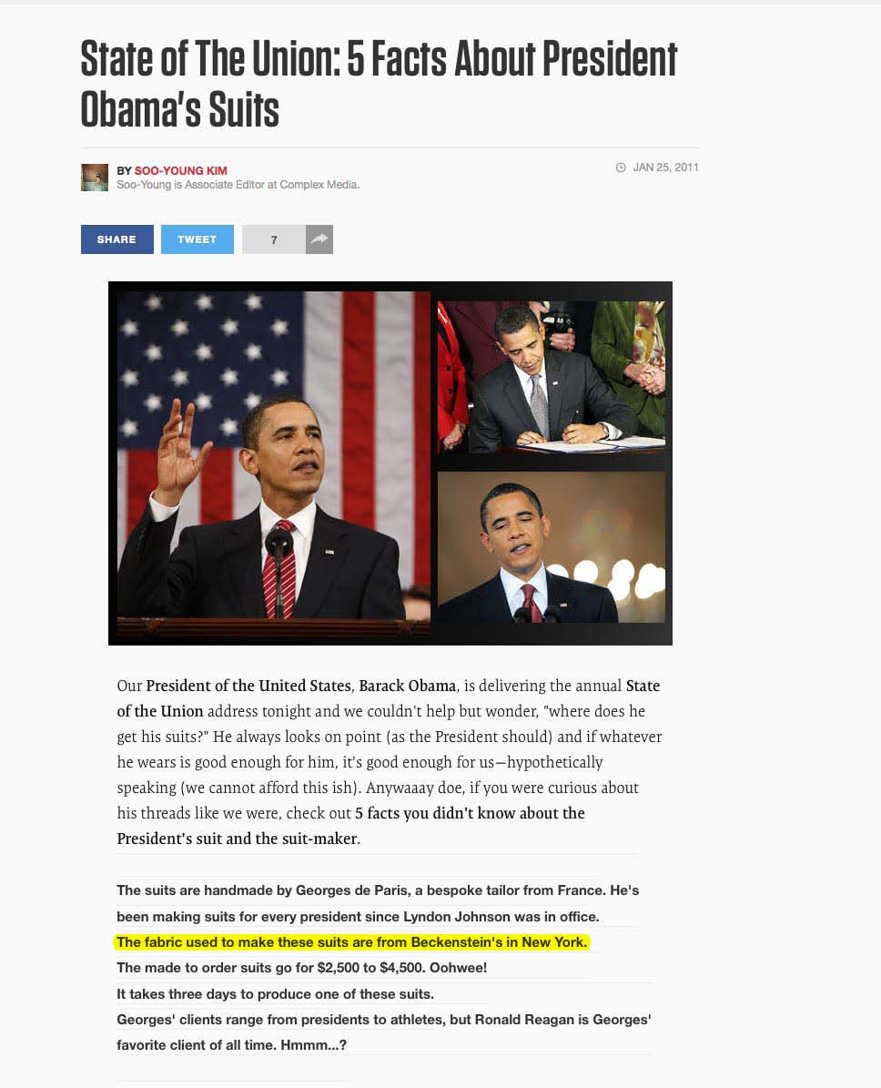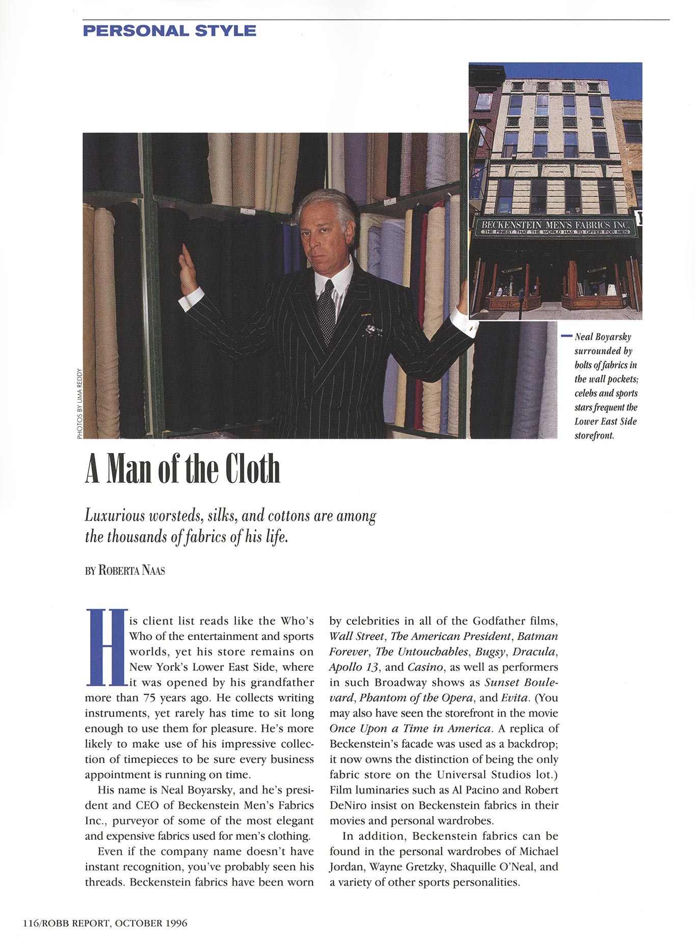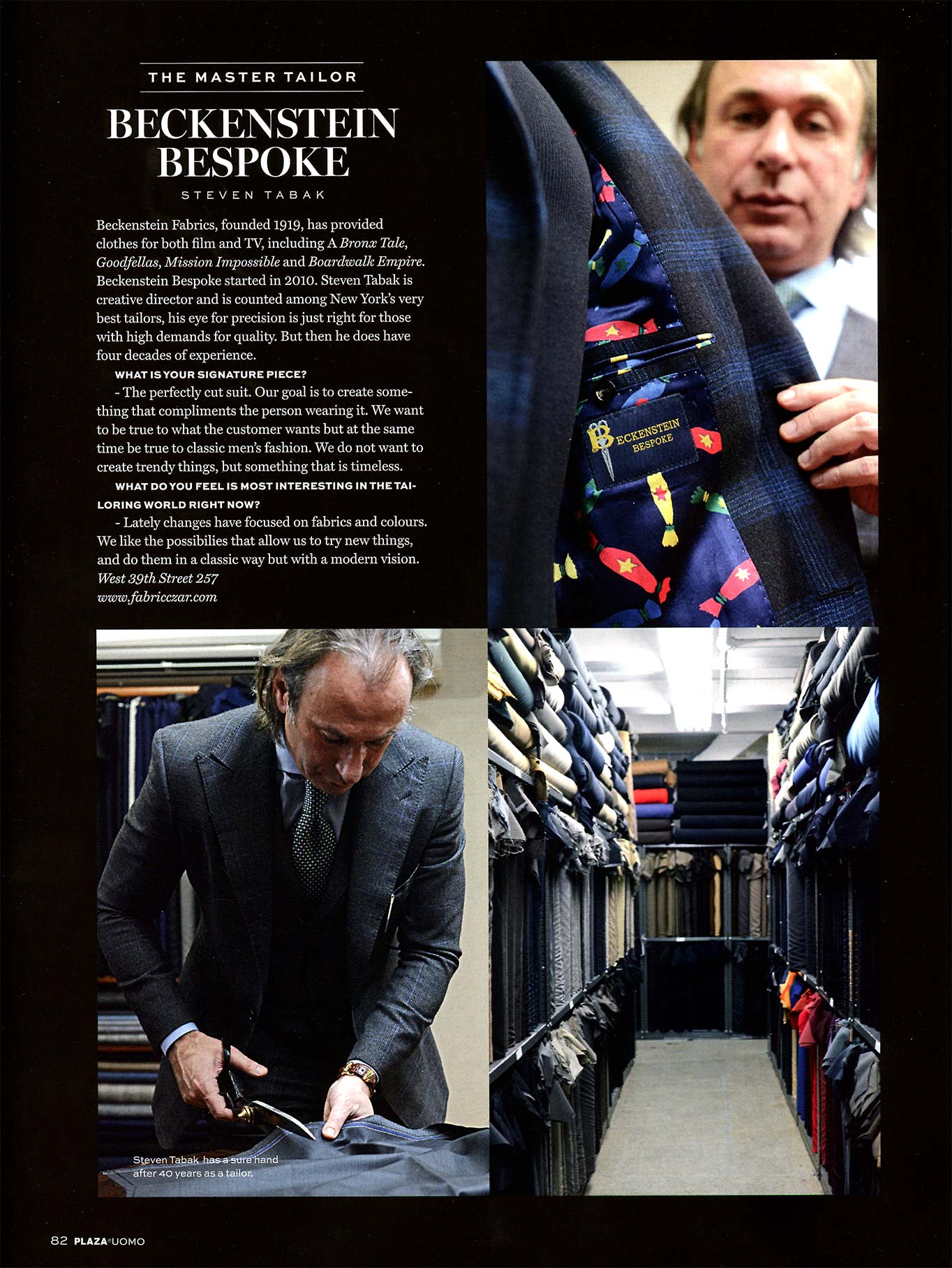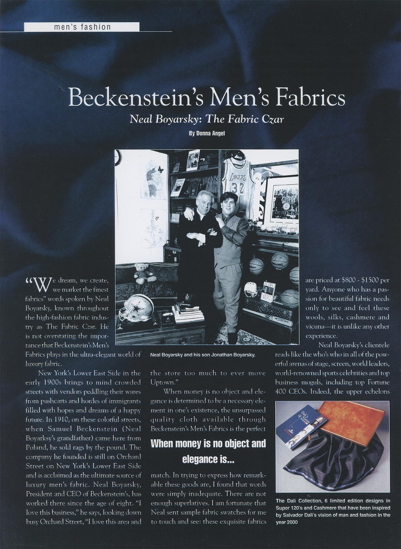 PRESS FEATURESPlaza Uomo2015 The Rake (Russia)April – May 2015 Bloomberg“A Suit That Fits, With Wall St.’s Fabric Czar” – August 2012 Vanity FairJune 2009 DNR Textile Report“The Godfather of Men’s Wear” – July 9, 2007 Trade NewsJuly 9, 2007 DorsoWinter 2003 Esquire“Man of the Cloth” – March 1998 DNRMarch 12, 1997 Robb Report“A Man of the Cloth” – October 1996 USA Today“Hollywood’s Common Thread” – September 30, 1996 Daily News“Material Guy” – February 18, 1996 Opulence Behind The Scene Beckenstein Men’s Fabric Day Press MentionsThe Daily Beast“How Custom Tailoring Is Your Secret Weapon” – September 27, 2016 Ocean Drive“How Stylist Calyann Barnett Decides What Dwyane Wade Will Wear” – September 1, 2015 CBS News“The Dandy: Celebrating the Exquisite Gentleman” – June 15, 2014 T Magazine“Carmelo Anthony’s Friends and Family Celebrate His Latest Award” – August 23, 2013 Complex“State of The Union: 5 Facts About President Obama’s Suits” – January 25, 2011