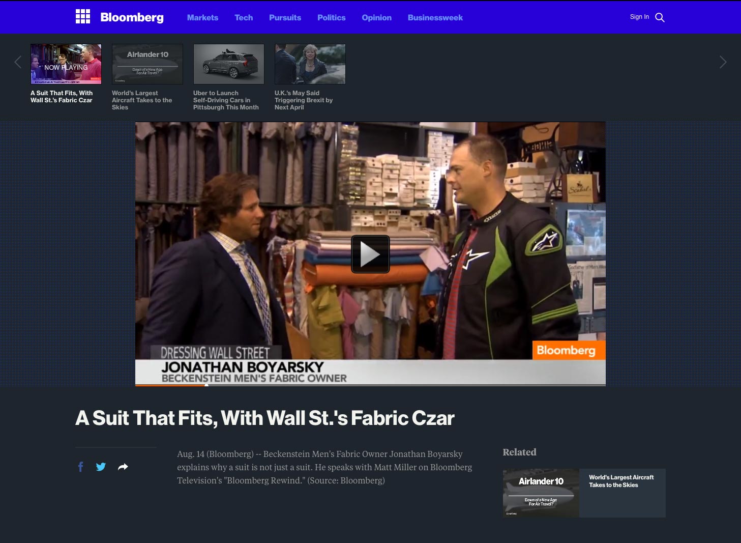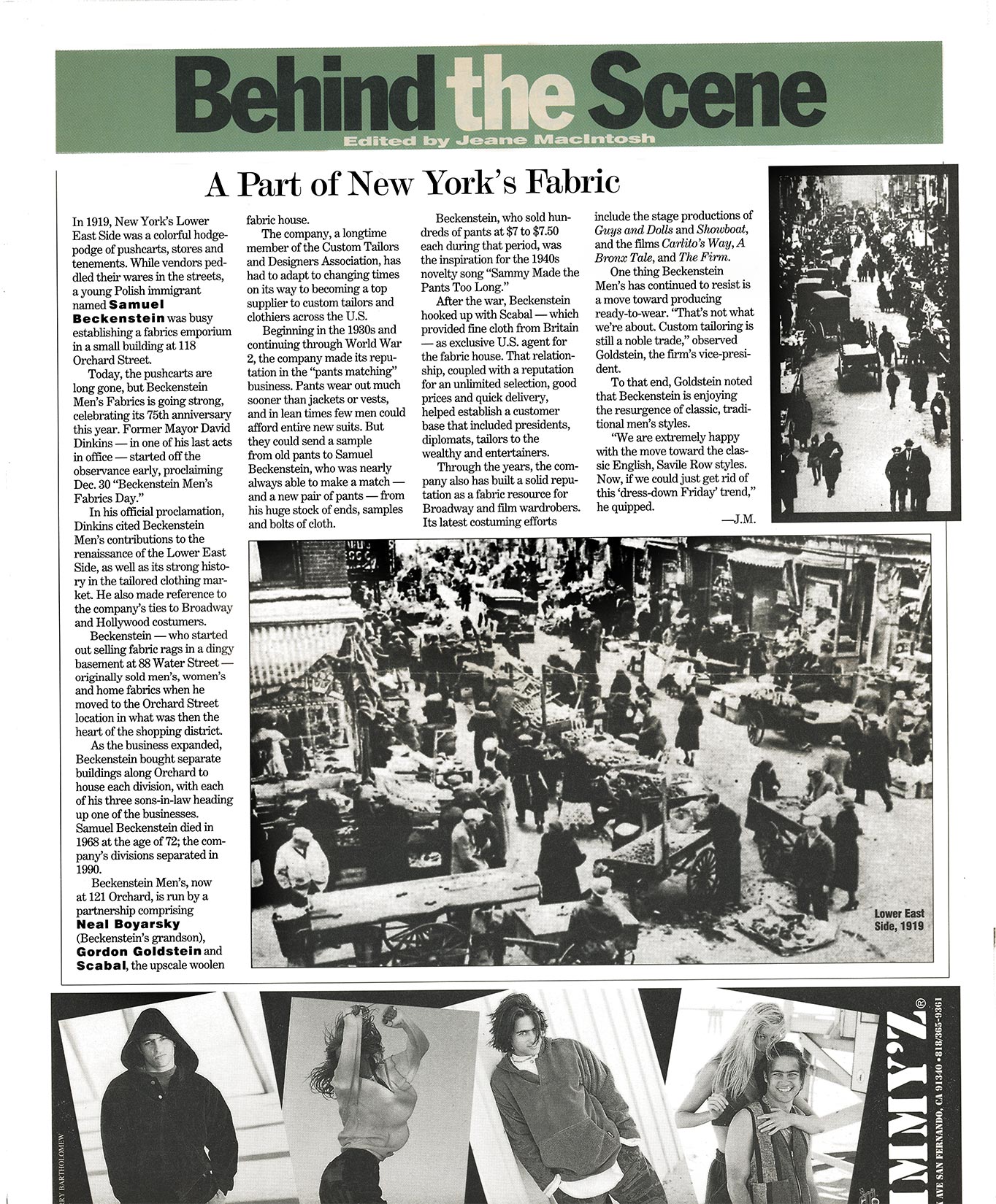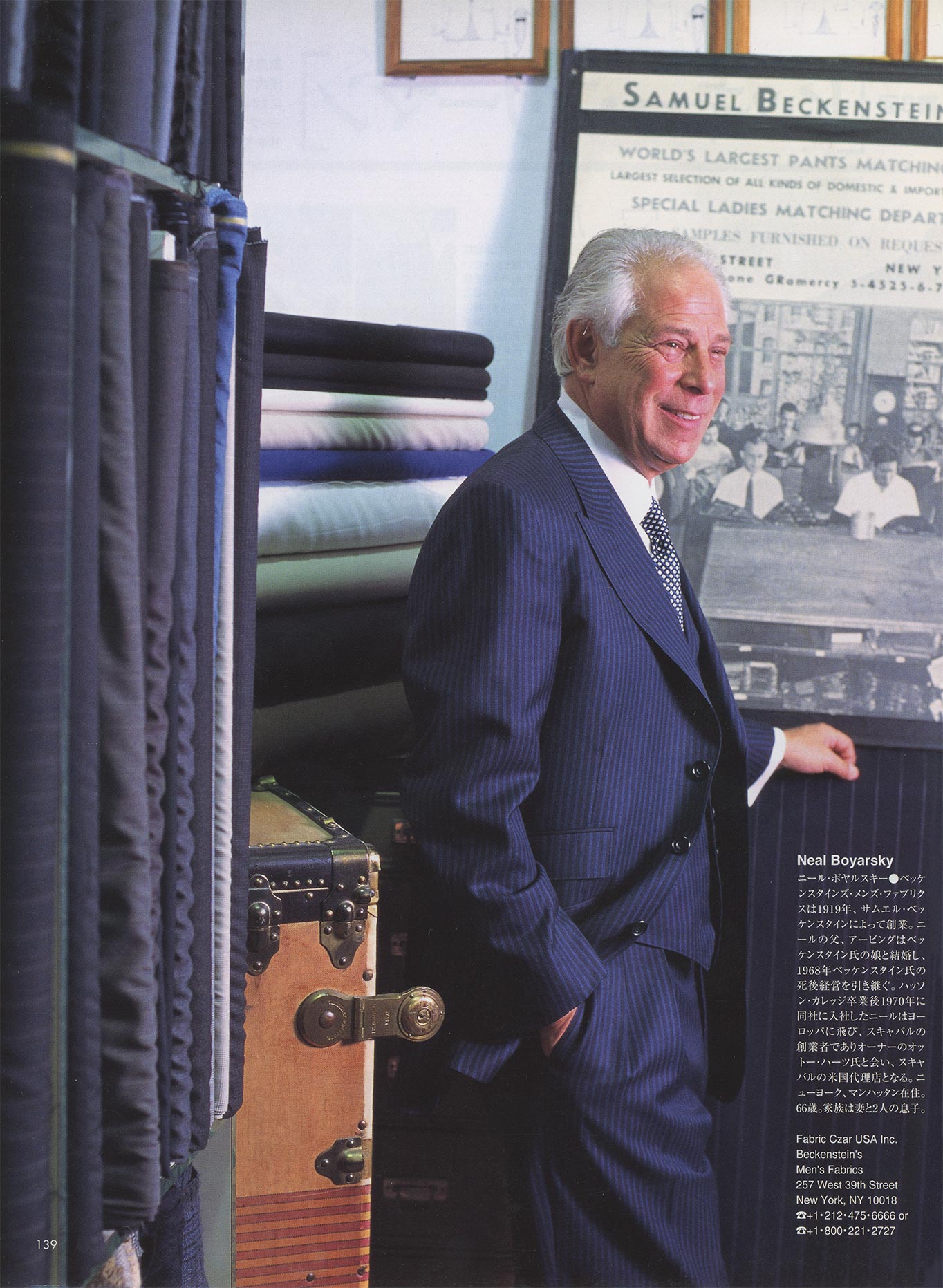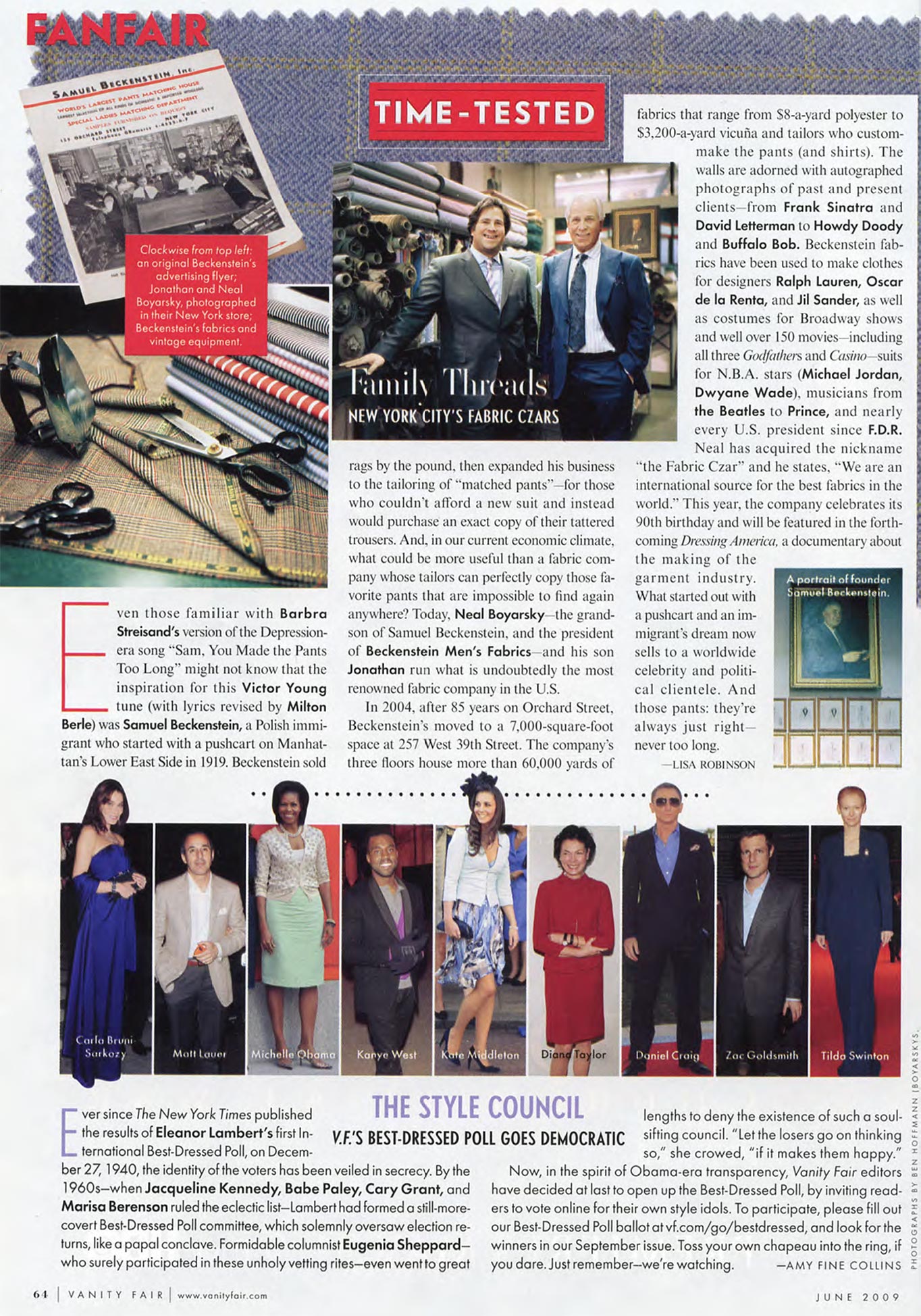 PRESS FEATURESPlaza Uomo2015 The Rake (Russia)April – May 2015 Bloomberg“A Suit That Fits, With Wall St.’s Fabric Czar” – August 2012 Vanity FairJune 2009 DNR Textile Report“The Godfather of Men’s Wear” – July 9, 2007 Trade NewsJuly 9, 2007 DorsoWinter 2003 Esquire“Man of the Cloth” – March 1998 DNRMarch 12, 1997 Robb Report“A Man of the Cloth” – October 1996 USA Today“Hollywood’s Common Thread” – September 30, 1996 Daily News“Material Guy” – February 18, 1996 Opulence Behind The Scene Beckenstein Men’s Fabric Day Press MentionsThe Daily Beast“How Custom Tailoring Is Your Secret Weapon” – September 27, 2016 Ocean Drive“How Stylist Calyann Barnett Decides What Dwyane Wade Will Wear” – September 1, 2015 CBS News“The Dandy: Celebrating the Exquisite Gentleman” – June 15, 2014 T Magazine“Carmelo Anthony’s Friends and Family Celebrate His Latest Award” – August 23, 2013 Complex“State of The Union: 5 Facts About President Obama’s Suits” – January 25, 2011