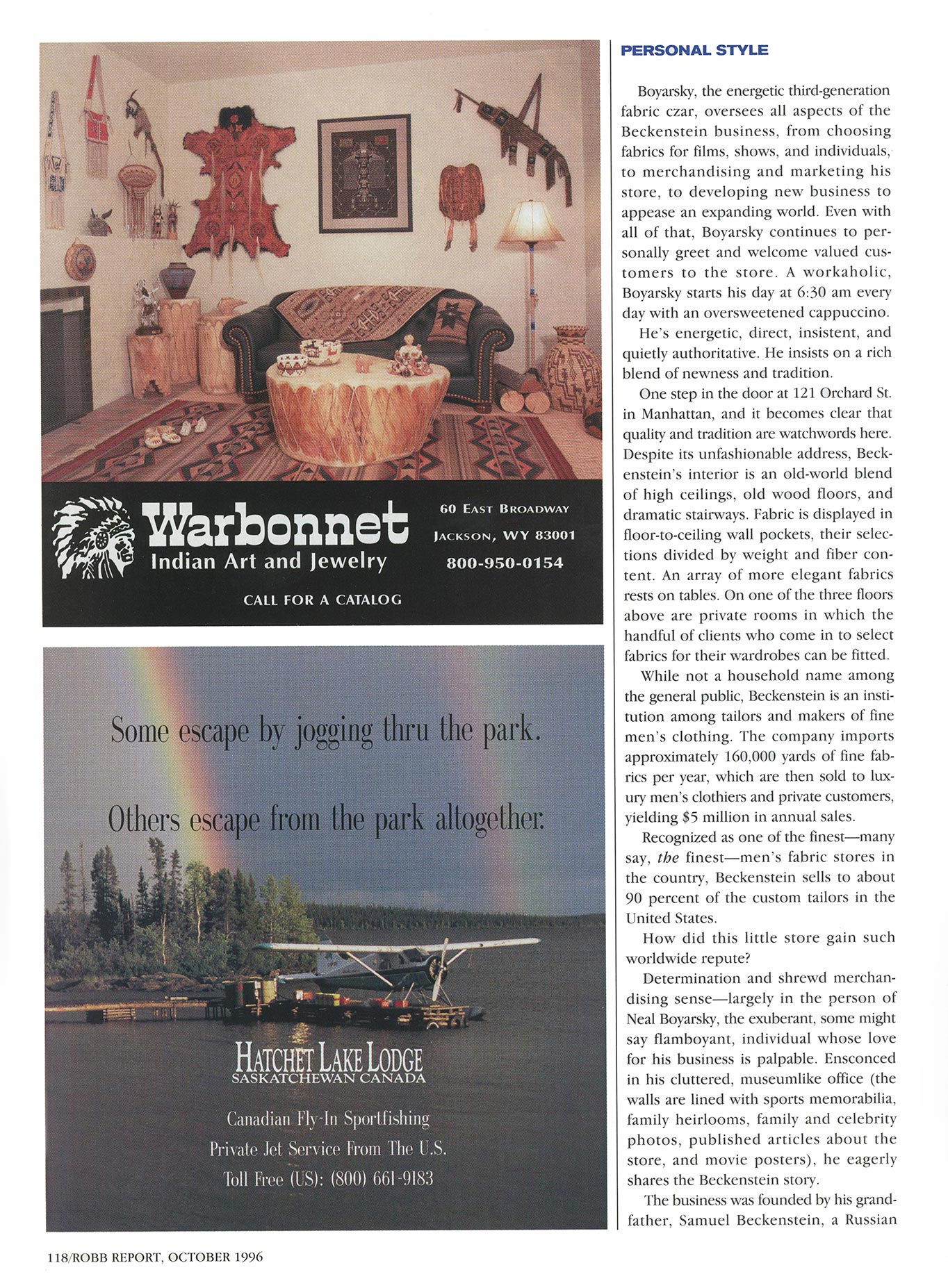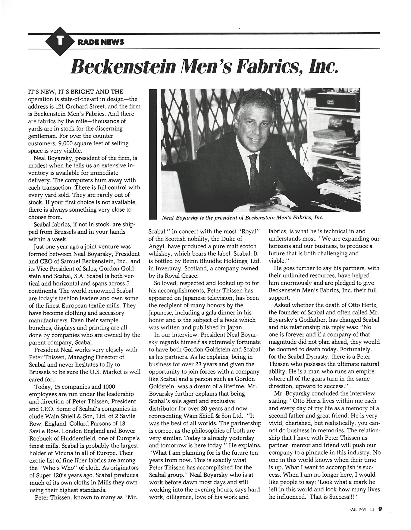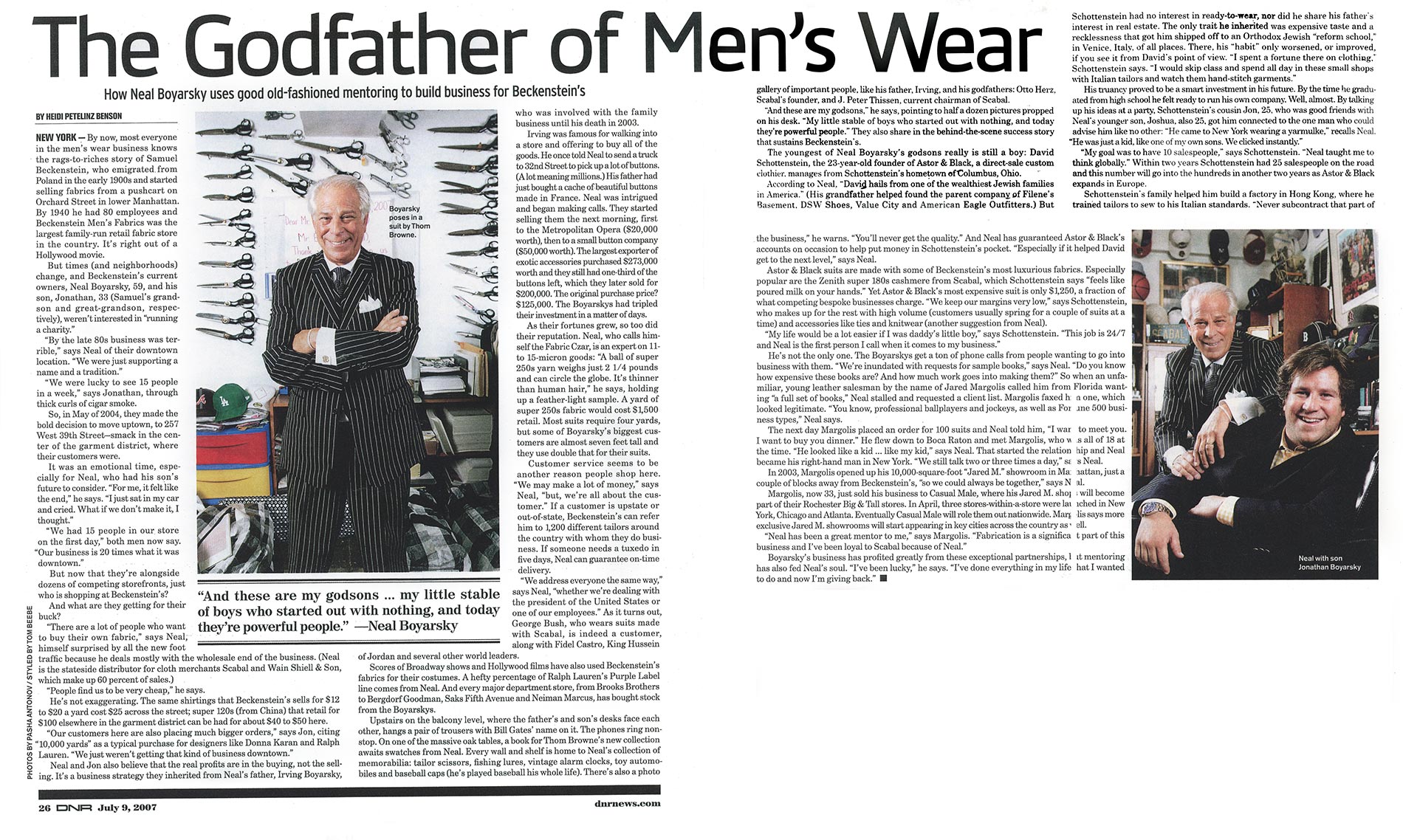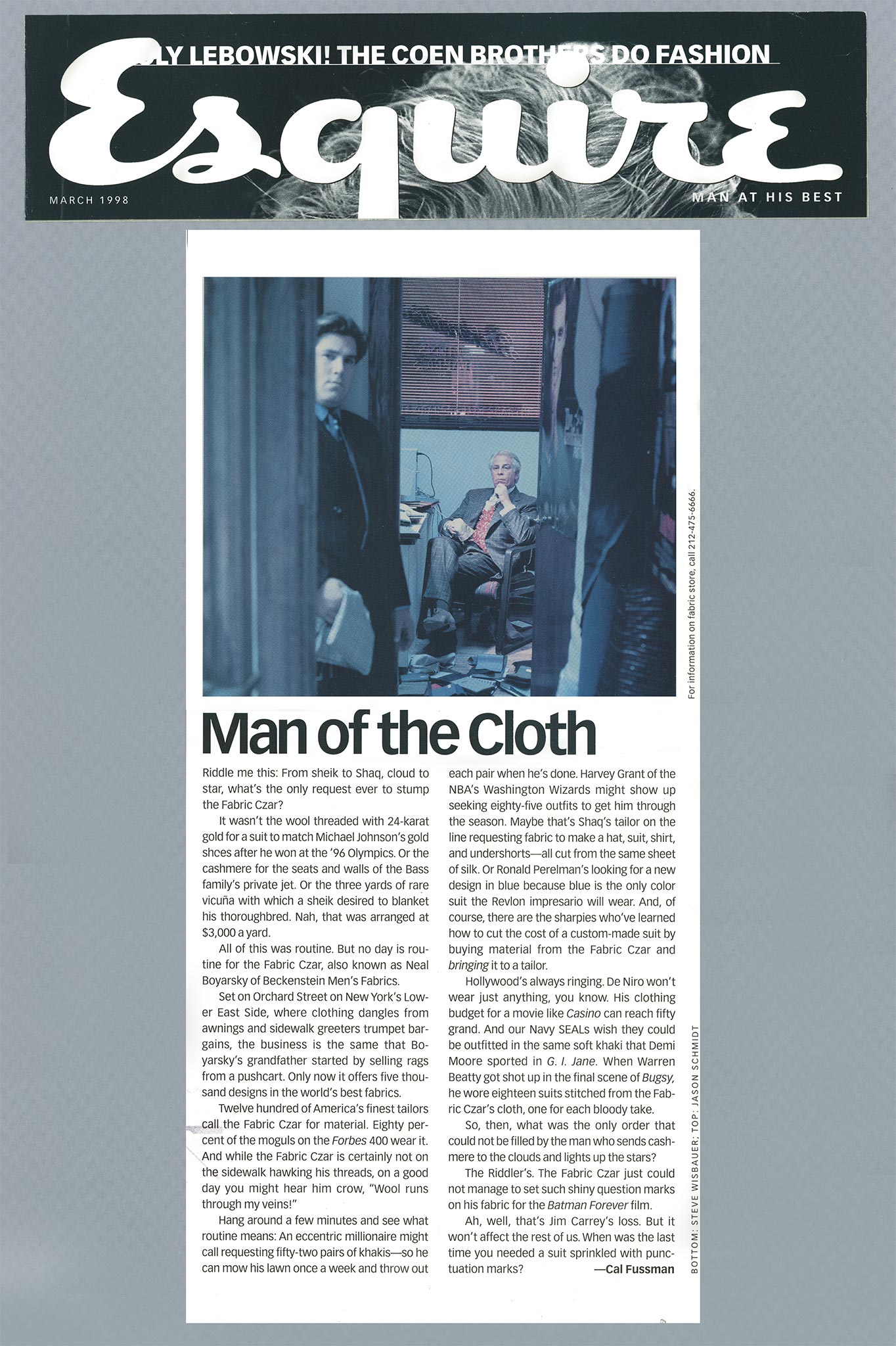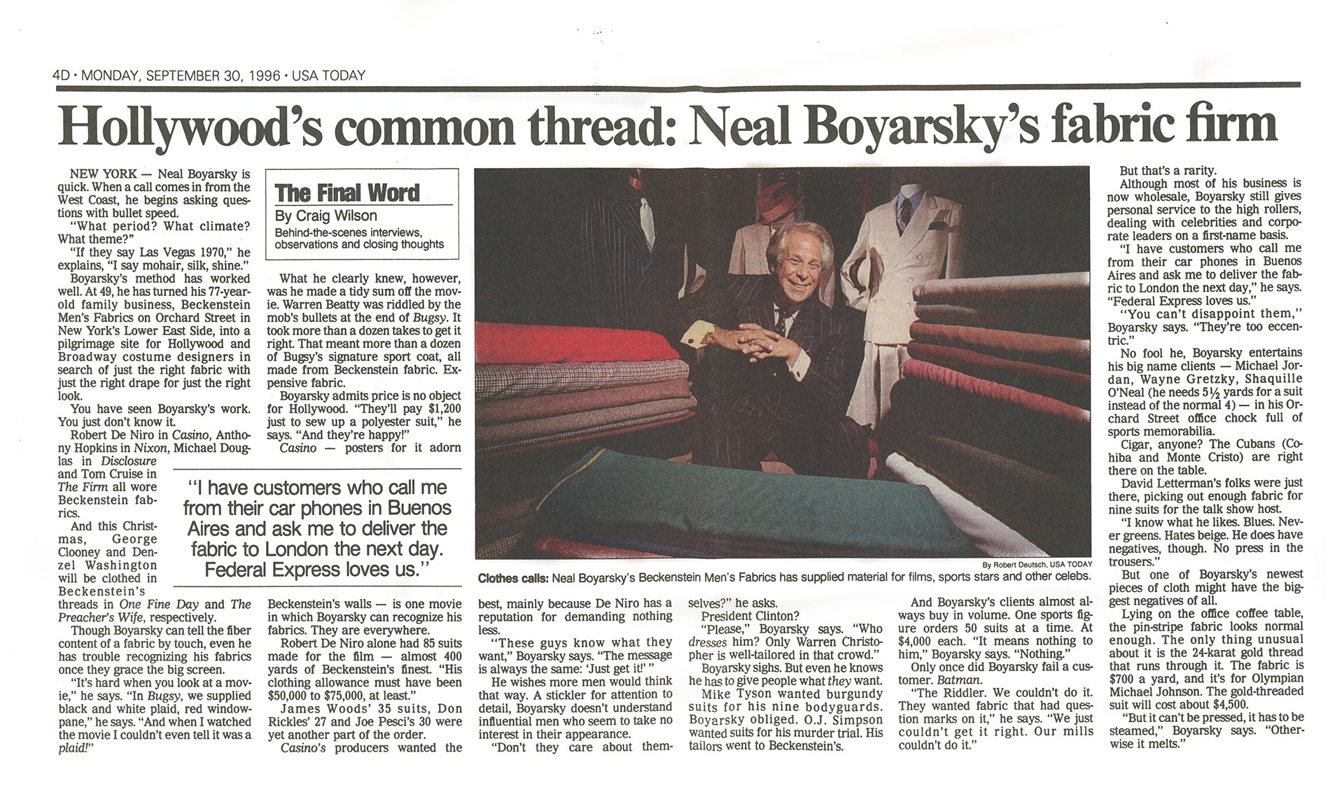 PRESS FEATURESPlaza Uomo2015 The Rake (Russia)April – May 2015 Bloomberg“A Suit That Fits, With Wall St.’s Fabric Czar” – August 2012 Vanity FairJune 2009 DNR Textile Report“The Godfather of Men’s Wear” – July 9, 2007 Trade NewsJuly 9, 2007 DorsoWinter 2003 Esquire“Man of the Cloth” – March 1998 DNRMarch 12, 1997 Robb Report“A Man of the Cloth” – October 1996 USA Today“Hollywood’s Common Thread” – September 30, 1996 Daily News“Material Guy” – February 18, 1996 Opulence Behind The Scene Beckenstein Men’s Fabric Day Press MentionsThe Daily Beast“How Custom Tailoring Is Your Secret Weapon” – September 27, 2016 Ocean Drive“How Stylist Calyann Barnett Decides What Dwyane Wade Will Wear” – September 1, 2015 CBS News“The Dandy: Celebrating the Exquisite Gentleman” – June 15, 2014 T Magazine“Carmelo Anthony’s Friends and Family Celebrate His Latest Award” – August 23, 2013 Complex“State of The Union: 5 Facts About President Obama’s Suits” – January 25, 2011