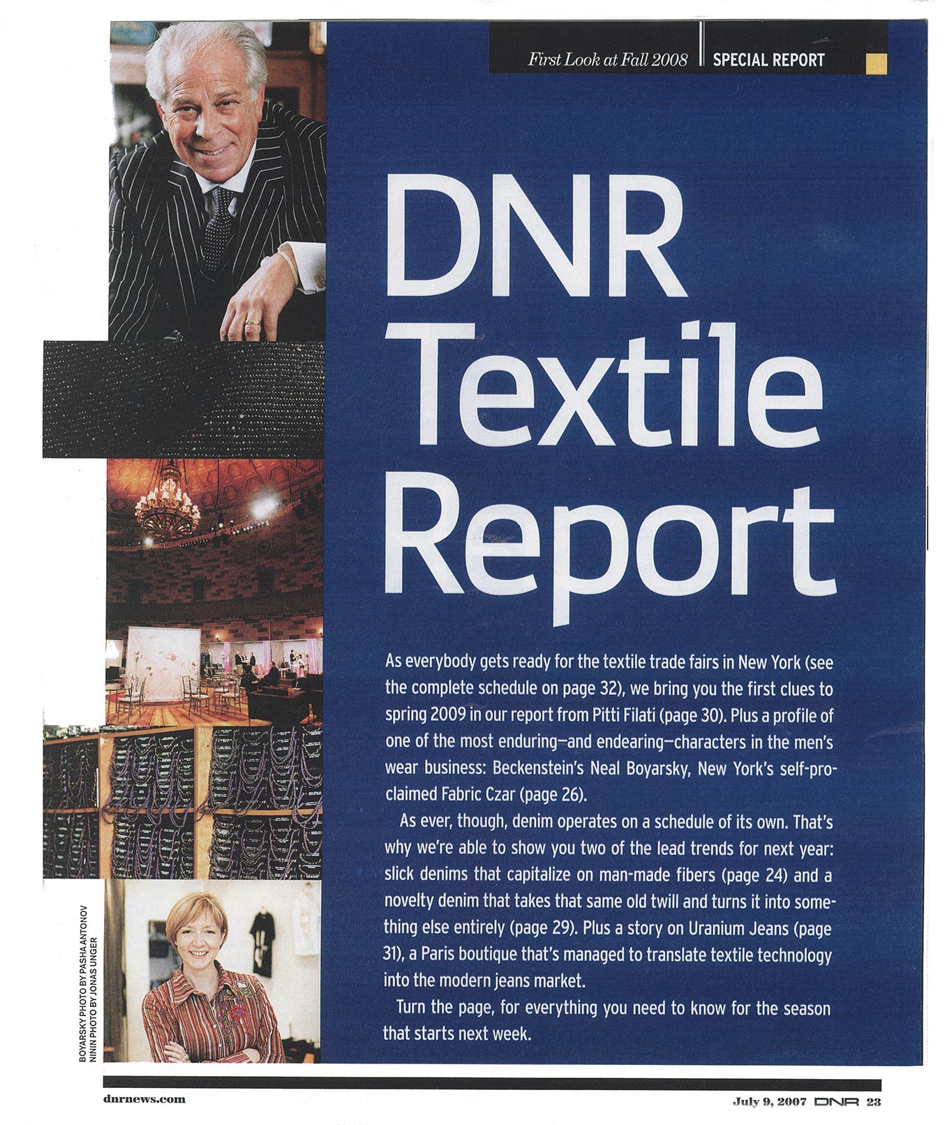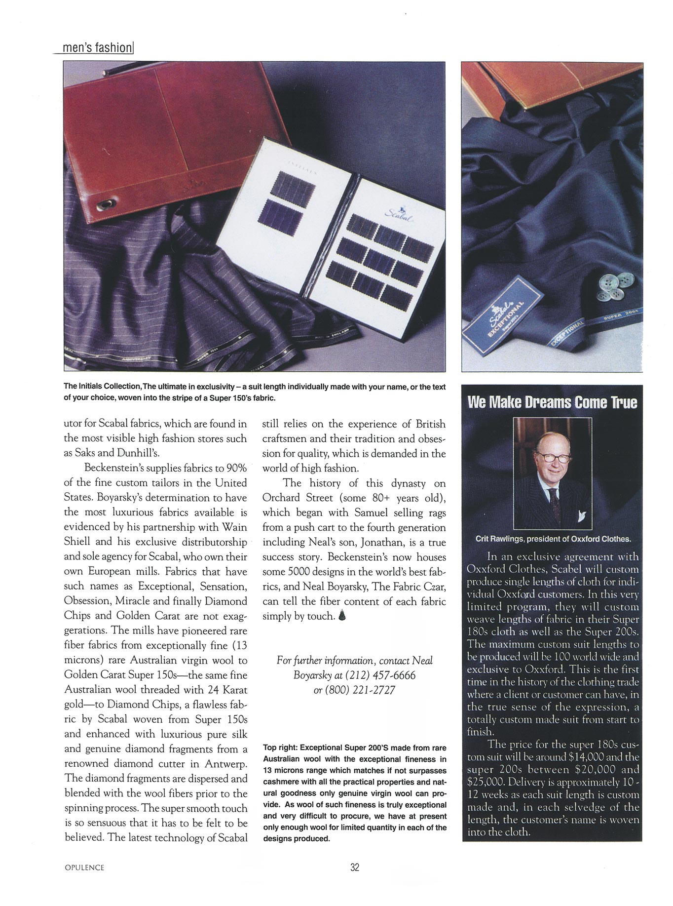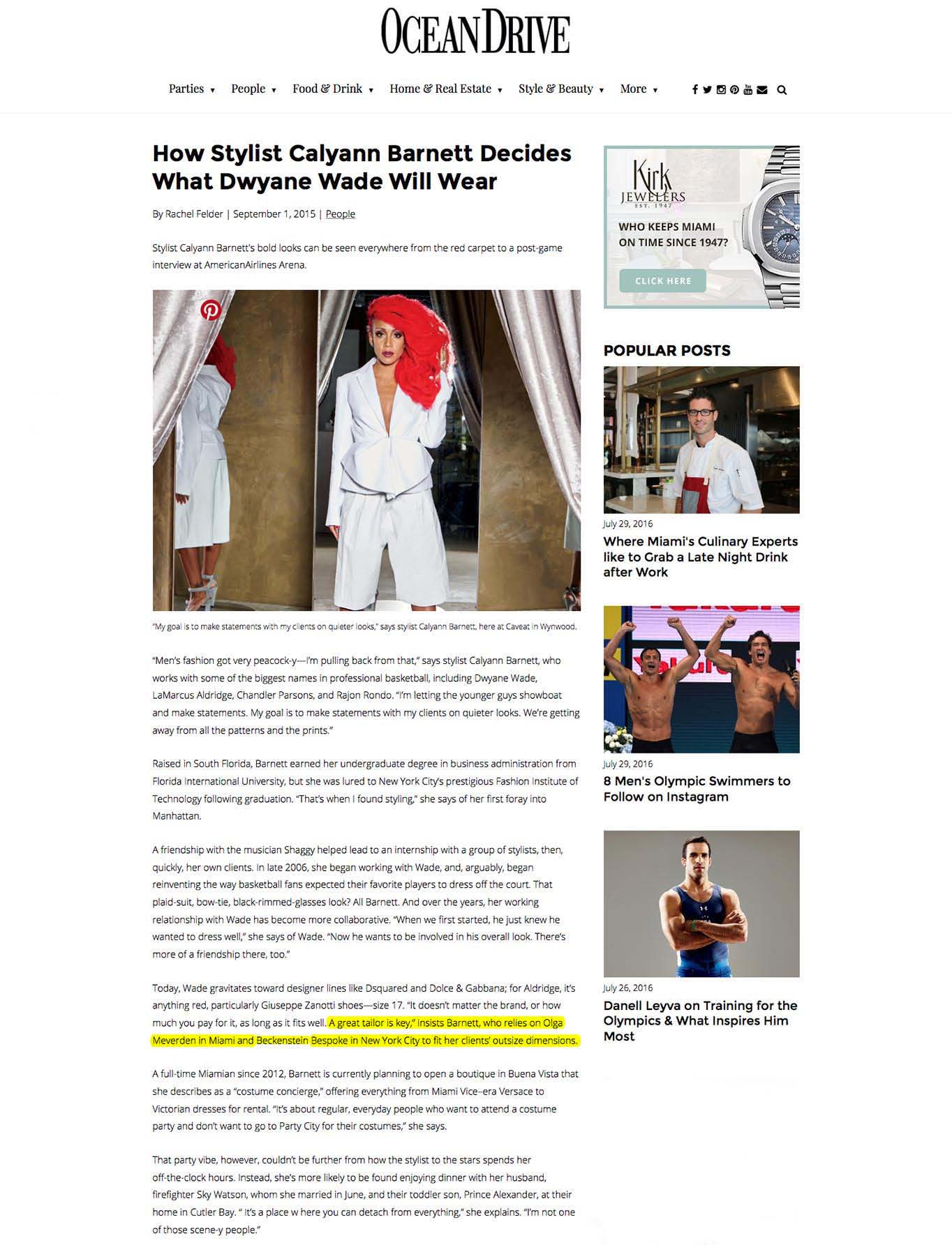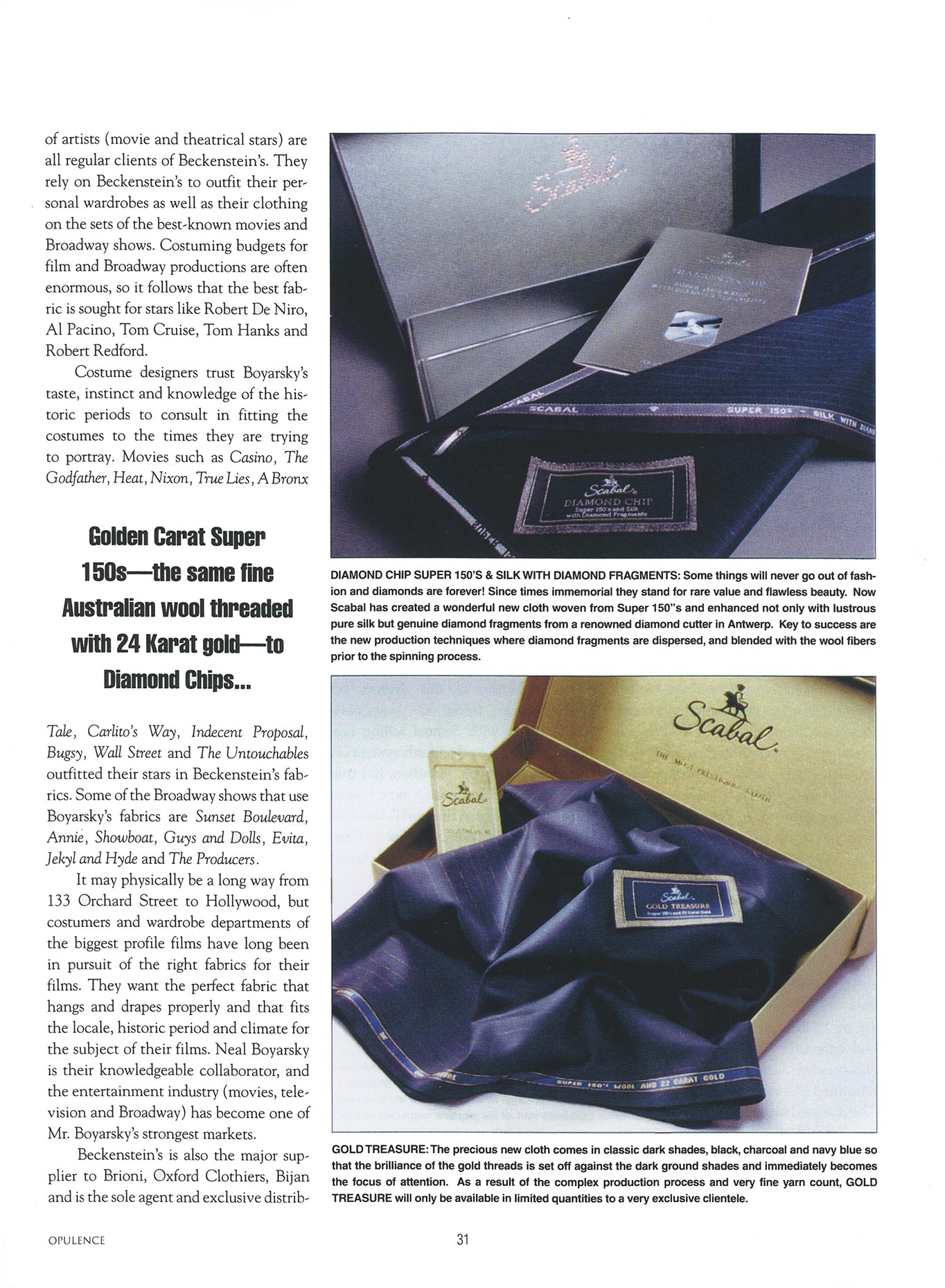 PRESS FEATURESPlaza Uomo2015 The Rake (Russia)April – May 2015 Bloomberg“A Suit That Fits, With Wall St.’s Fabric Czar” – August 2012 Vanity FairJune 2009 DNR Textile Report“The Godfather of Men’s Wear” – July 9, 2007 Trade NewsJuly 9, 2007 DorsoWinter 2003 Esquire“Man of the Cloth” – March 1998 DNRMarch 12, 1997 Robb Report“A Man of the Cloth” – October 1996 USA Today“Hollywood’s Common Thread” – September 30, 1996 Daily News“Material Guy” – February 18, 1996 Opulence Behind The Scene Beckenstein Men’s Fabric Day Press MentionsThe Daily Beast“How Custom Tailoring Is Your Secret Weapon” – September 27, 2016 Ocean Drive“How Stylist Calyann Barnett Decides What Dwyane Wade Will Wear” – September 1, 2015 CBS News“The Dandy: Celebrating the Exquisite Gentleman” – June 15, 2014 T Magazine“Carmelo Anthony’s Friends and Family Celebrate His Latest Award” – August 23, 2013 Complex“State of The Union: 5 Facts About President Obama’s Suits” – January 25, 2011