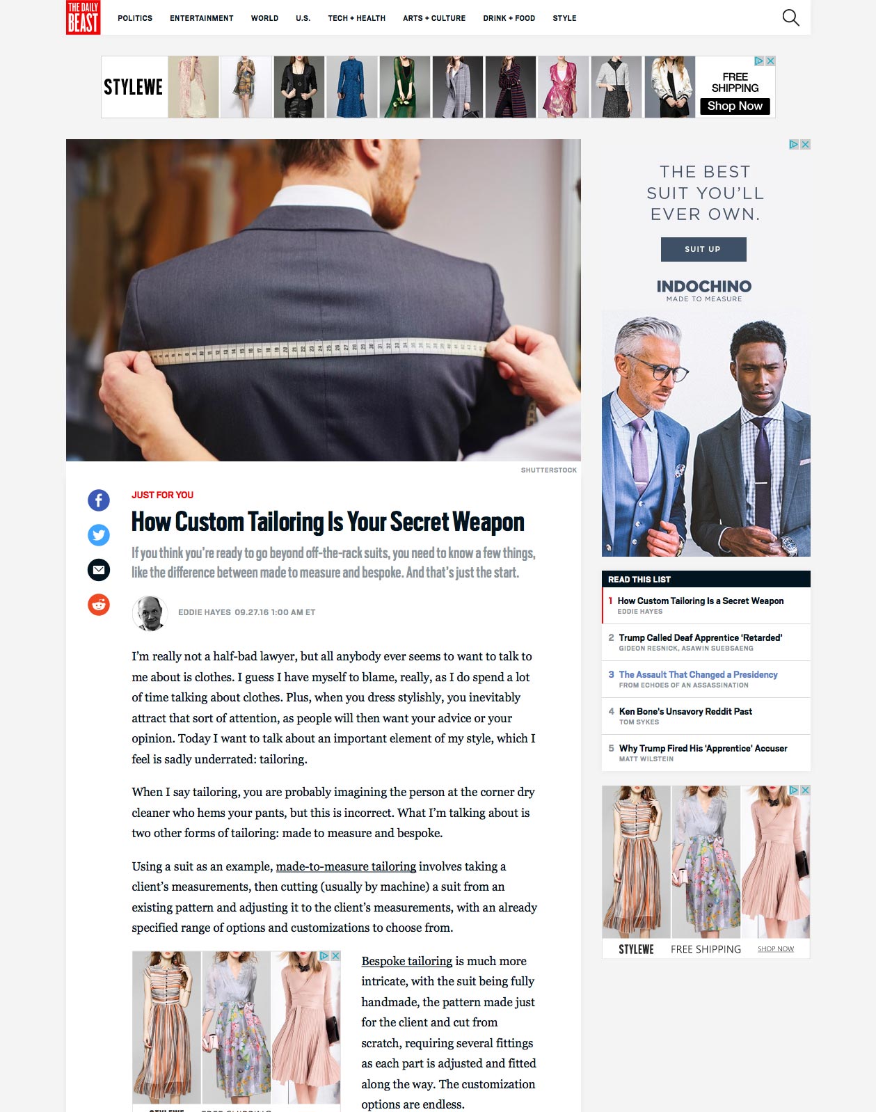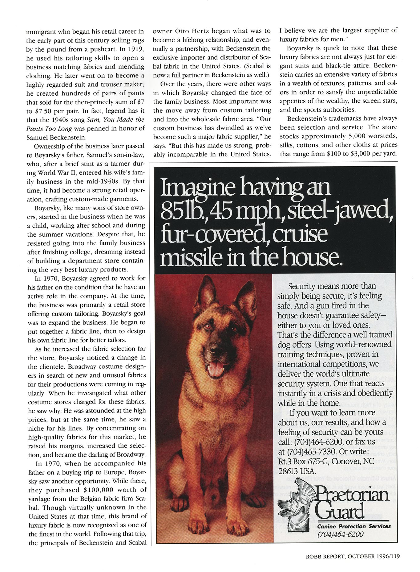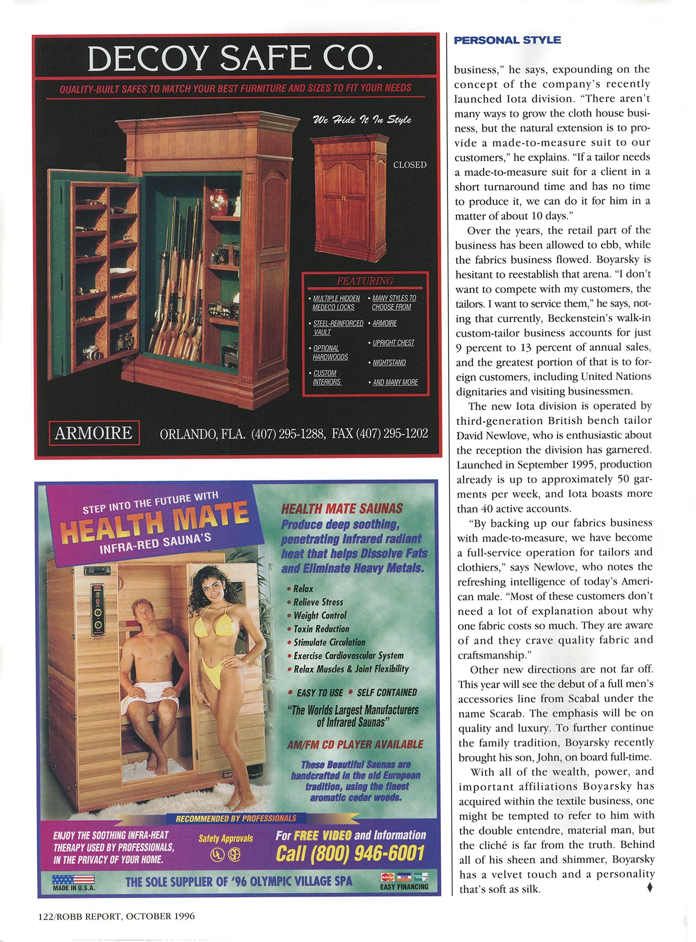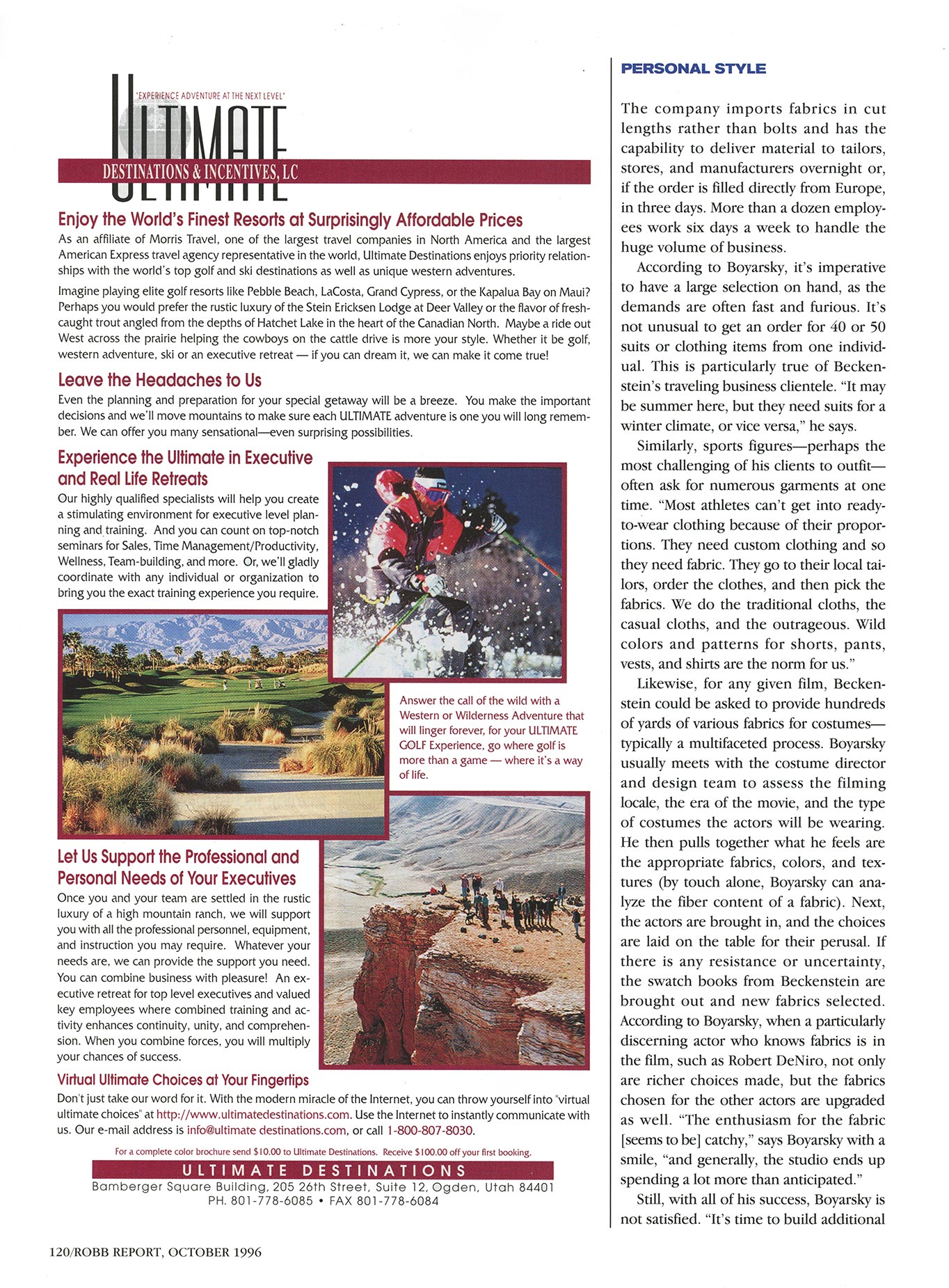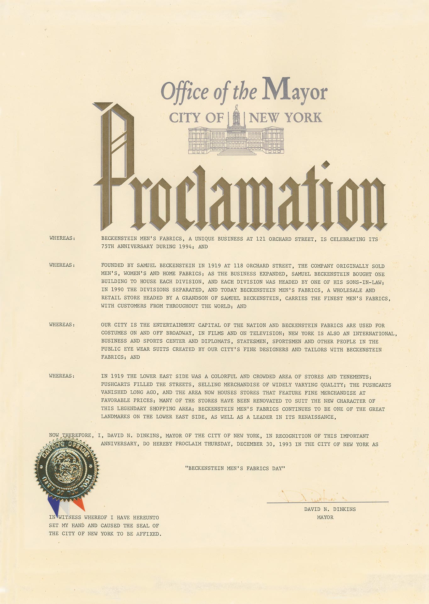 PRESS FEATURESPlaza Uomo2015 The Rake (Russia)April – May 2015 Bloomberg“A Suit That Fits, With Wall St.’s Fabric Czar” – August 2012 Vanity FairJune 2009 DNR Textile Report“The Godfather of Men’s Wear” – July 9, 2007 Trade NewsJuly 9, 2007 DorsoWinter 2003 Esquire“Man of the Cloth” – March 1998 DNRMarch 12, 1997 Robb Report“A Man of the Cloth” – October 1996 USA Today“Hollywood’s Common Thread” – September 30, 1996 Daily News“Material Guy” – February 18, 1996 Opulence Behind The Scene Beckenstein Men’s Fabric Day Press MentionsThe Daily Beast“How Custom Tailoring Is Your Secret Weapon” – September 27, 2016 Ocean Drive“How Stylist Calyann Barnett Decides What Dwyane Wade Will Wear” – September 1, 2015 CBS News“The Dandy: Celebrating the Exquisite Gentleman” – June 15, 2014 T Magazine“Carmelo Anthony’s Friends and Family Celebrate His Latest Award” – August 23, 2013 Complex“State of The Union: 5 Facts About President Obama’s Suits” – January 25, 2011